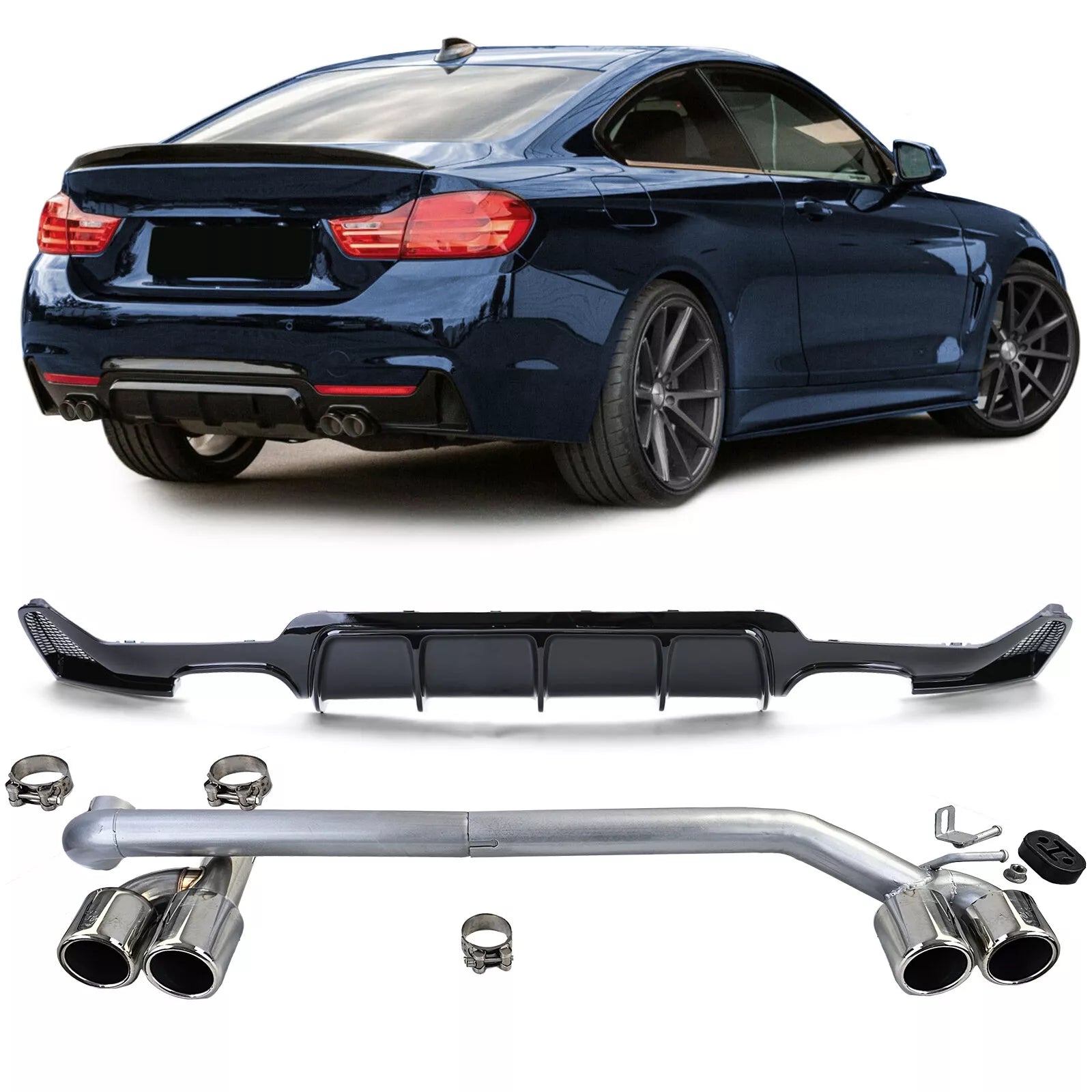 Scopri il set di conversione, composto da un diffusore posteriore in look performante, nero lucido e un set di conversione del terminale di scarico in look sportivo con doppi terminali di scarico cromati su entrambi i lati. Questo set conferisce alla tua BMW Serie 4 Tipo F32 Coupé / F33 Cabrio / F36 Gran Coupé (anni di costruzione 2013-2021) con i modelli 425d, 430d, 428i e 430i (a condizione che abbiano due terminali di scarico sul lato sinistro) un look sportivo e migliorato.