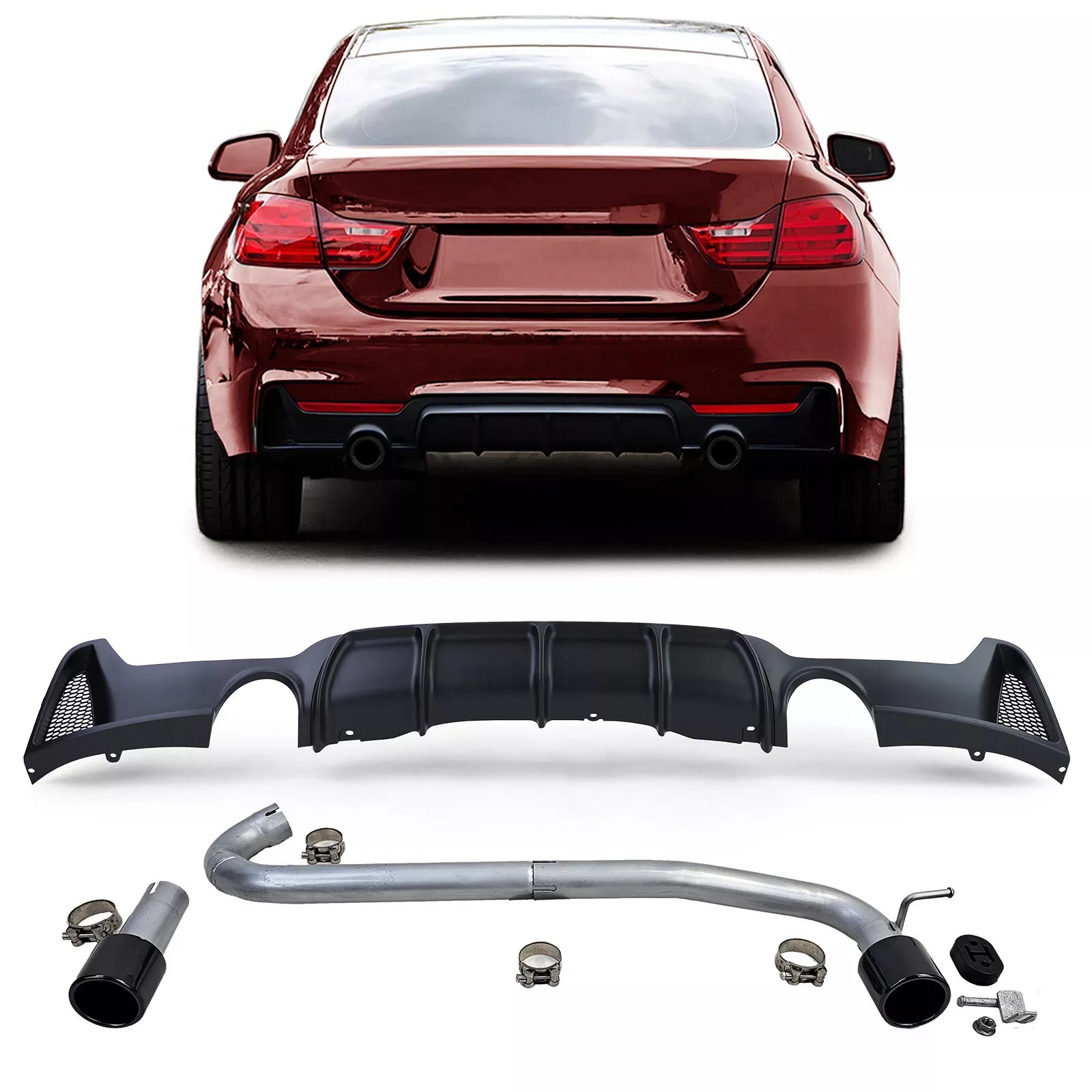 Scopri il set di conversione, composto da un diffusore posteriore nel look performante nero opaco e un set di conversione del terminale di scarico nel look 440 con terminali di scarico su entrambi i lati in nero lucido. Questo set conferisce alla tua BMW Serie 4 Tipo F32 Coupé / F33 Cabrio / F36 Gran Coupé (anni di costruzione 2013-2021) con i modelli 425d, 430d, 428i e 430i (a condizione che abbiano due terminali di scarico sul lato sinistro) un look sportivo e migliorato.