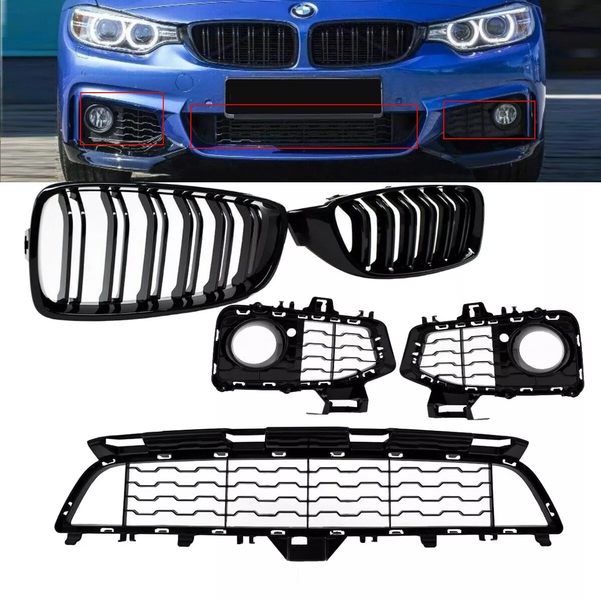 SET griglia paraurti nero lucido + griglia radiatore a doppia barra per BMW Serie 4 F32 F33 F36 pacchetto M dal 2013 al 2019