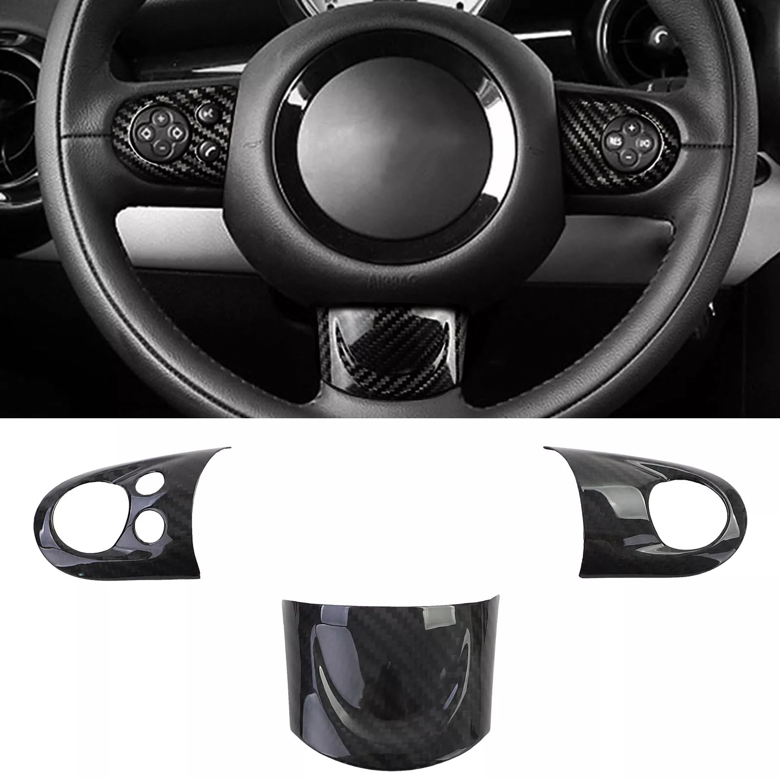 Il set da 3 pezzi di coprivolanti in vero carbonio è un accessorio di alta qualità che dona al tuo modello Mini R55, R56, R57, R58, R59 degli anni 2006-2016 un tocco di lusso. Tieni presente che questo set è compatibile solo con un volante multifunzione.
